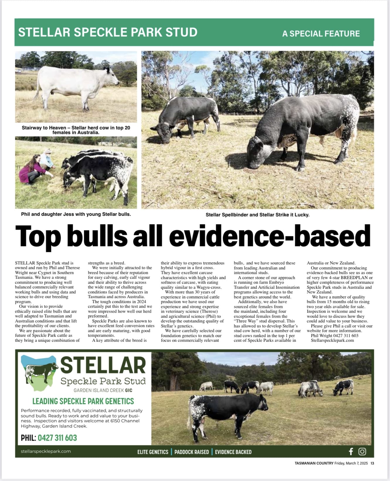 We passionately believe in the strengths and unique place Speckle Parks can play in the Australian cattle industry and were delighted to have the opportunity to discuss this in a recent article in the Tasmanian Country paper. Click on the image to read.